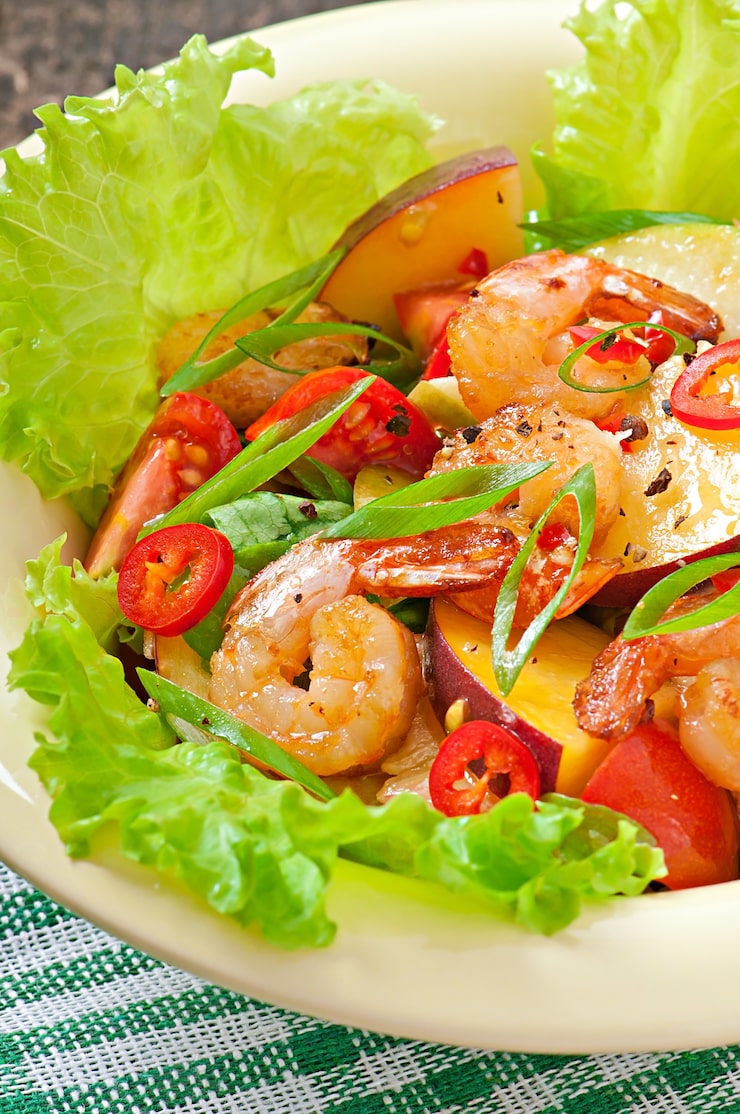 - Остывшую пасту соединяют с луком и тархуном, добавляют помидоры и креветки, снятые со шпажек, перемешивают, приправляют перцем и солью по вкусу. При желании можно добавить немного масла.