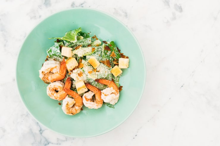 В салат также стоит добавить свежий огурец и немного шампиньонов, помимо креветок и фасоли. Все ингредиенты гармонично сочетаются, поэтому получается превосходное блюдо. Для заправки салата можно использовать соевый соус и несколько капель любимого масла. Салат можно подавать на обед или как ужин.