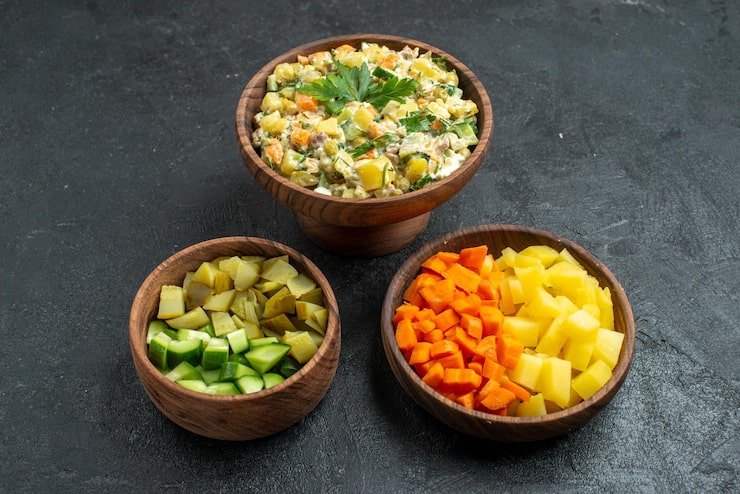Морковь необходимо отварить до готовности, затем охладить и нарезать кубиками. Огурцы, выращенные на грядке, также следует нарезать кубиками.