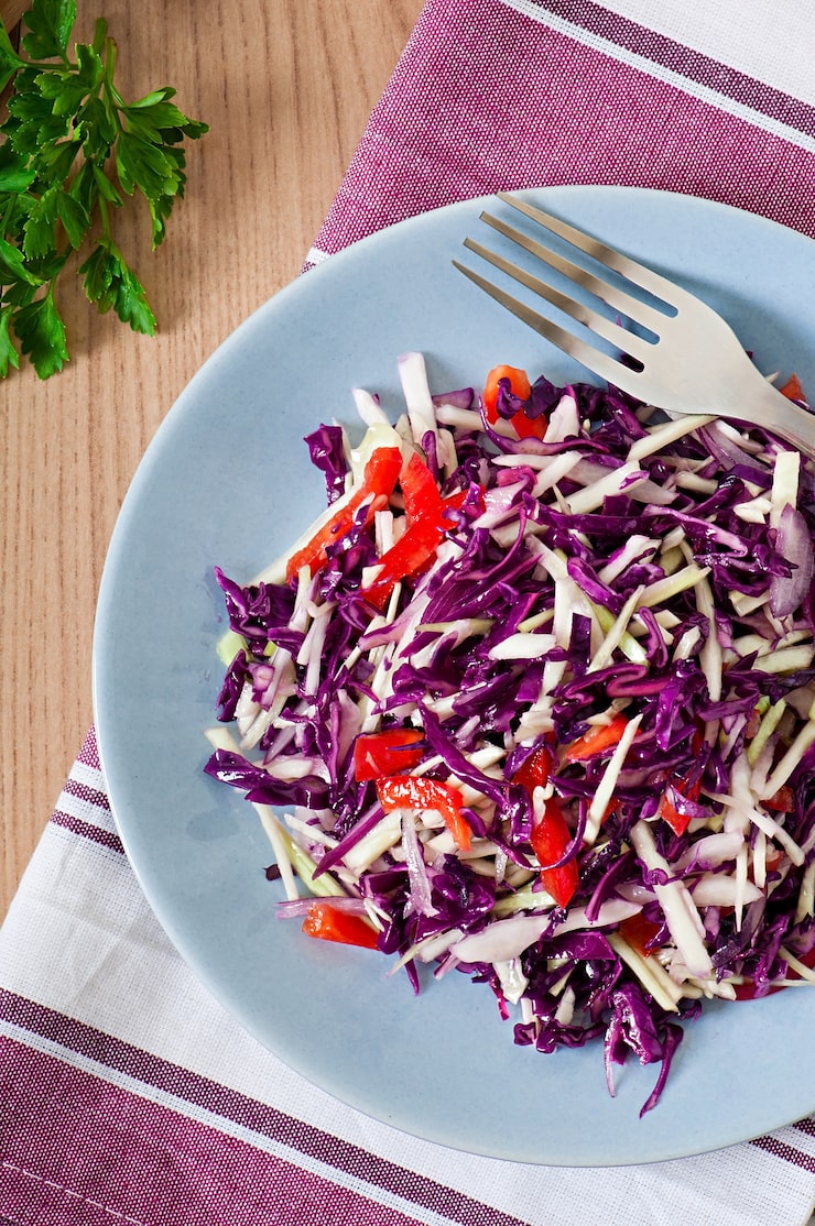 Твердую капусту допускается нарезать тонкими ломтиками и слегка помять. Это сделает салат более нежным и мягким.