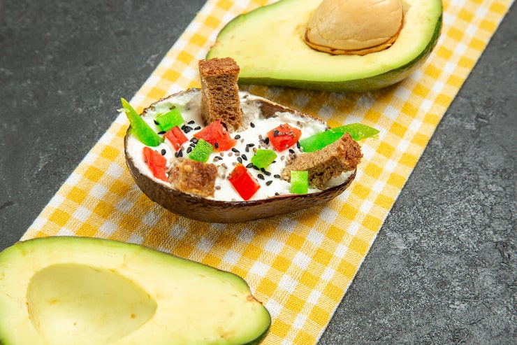 Извлеките из авокадо косточку и снимите кожуру. Мякоть порежьте тонкими ломтиками и разместите на тарелке, чередуя их с нарезкой из яиц.