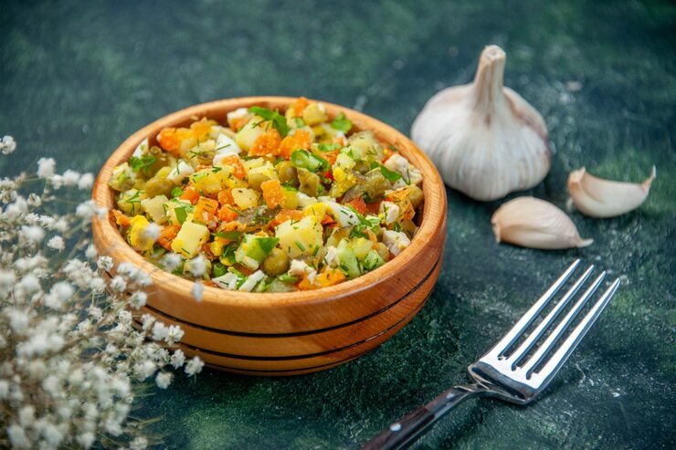 Объедините все ингредиенты. Заправьте салат, добавьте соль и перец по вкусу.