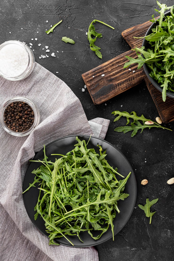 Листья рукколы промойте и просушите, затем поместите в глубокую миску.