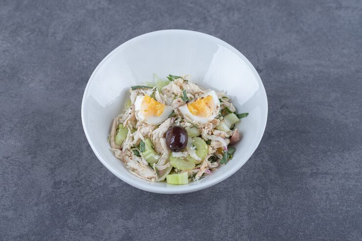 На лук наносим майонез, затем распределяем белки, после них – желтки, и украшаем блюдо. Готовому салату требуется охлаждение в холодильнике, после чего его можно подавать. Приятного аппетита!