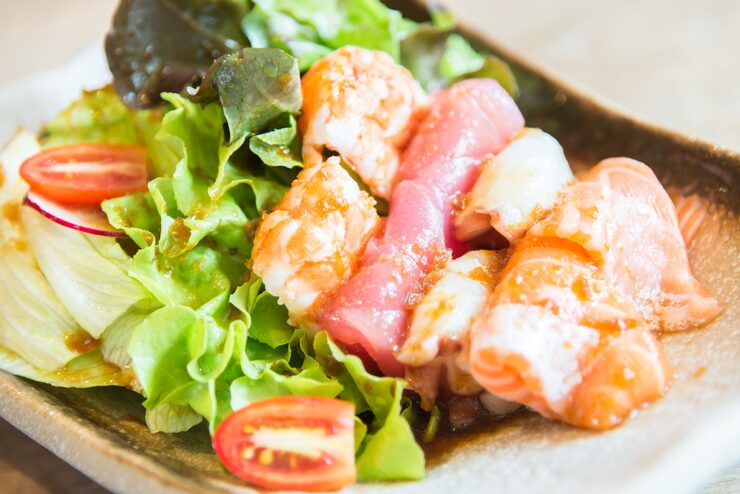 В качестве основы для салата используется семга, наиболее удачным сочетание получается с копченой рыбой, а также выбираются качественные крабовые палочки. В салат добавляют картофель, свежий огурец и яйцо, заправляют майонезом. Такой салат можно подавать как самостоятельное блюдо, при желании добавьте ломтик хлеба.