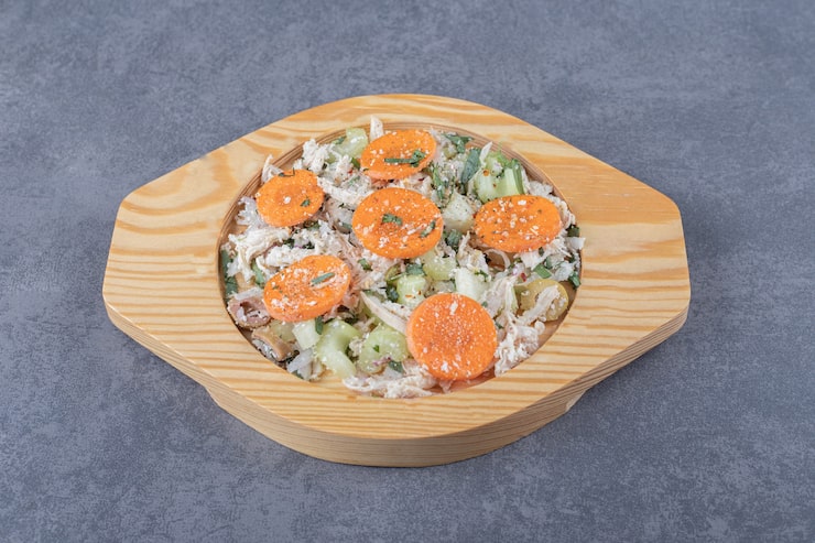 Готовый салат следует выложить на блюдо или тарелку и немедленно подавать к столу.