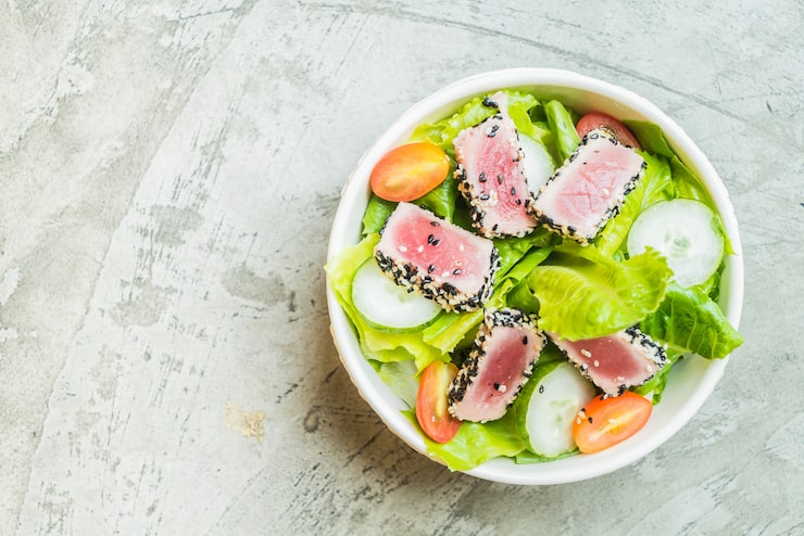 Салатные листья добавят объема салату с тунцом и белой фасолью, а огурцы придадут ему свежесть. Этот рецепт хорошо впишется в диетическое питание, и салат можно подать на ужин. В качестве заправки подойдет смесь масла и лимонного сока, или соус на основе йогурта, специй и чеснока.