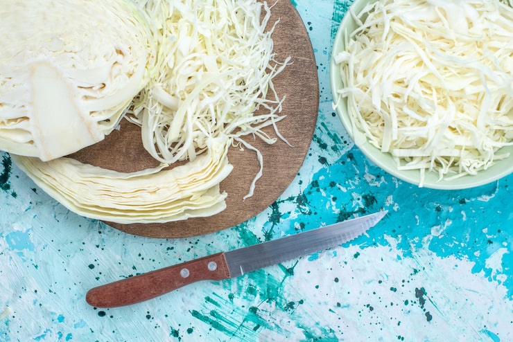 Нарежьте капусту тонкими ломтиками, а зелёный лук – отделите и используйте его среднюю часть.
