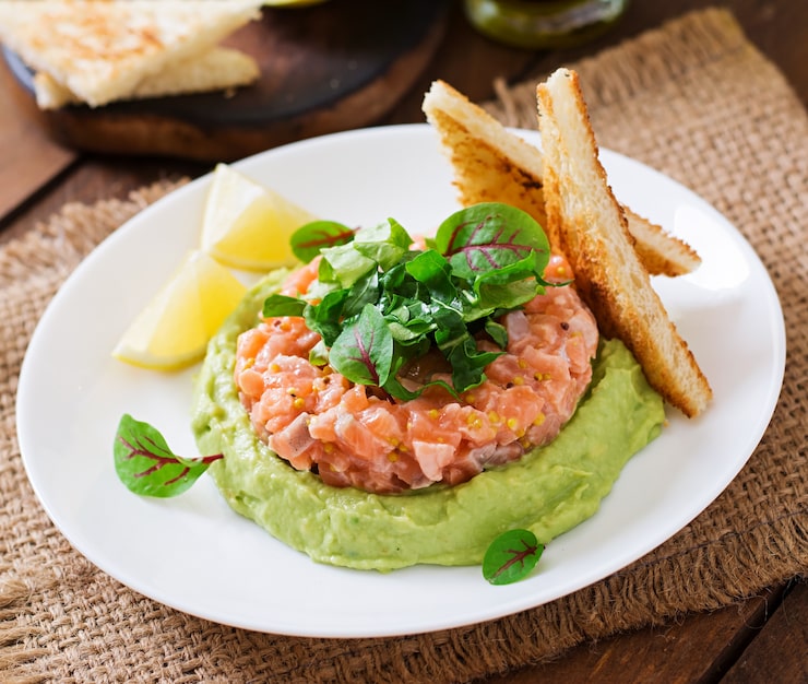 Искренне говоря, я пробовала готовить этот вариант и с селедкой, но результат оказался неудовлетворительным. Гораздо лучше получается с более мягкой и нежной рыбой. Лосось можно использовать консервированный, соленый или копченый. Авокадо выбирайте мягкое, спелое. Этот салат можно подавать и на праздничный стол, и на обычный обед.