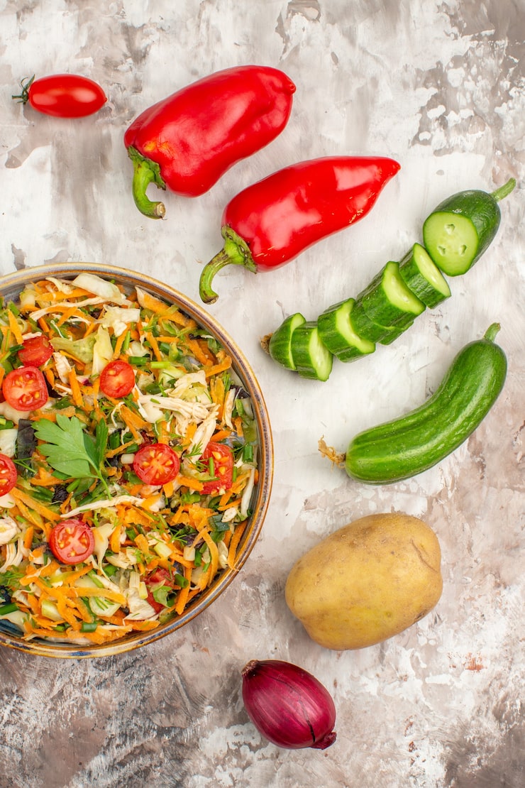 Отварную курицу руками или ножом разберите на волокна. Помидоры промойте в воде и вырежьте из них зеленые сердцевинки. Нарежьте ломтиками. Капусту мелко нашинкуйте. По желанию можете добавить картофель-фри или ломтики отварного картофеля, соленый огурец.