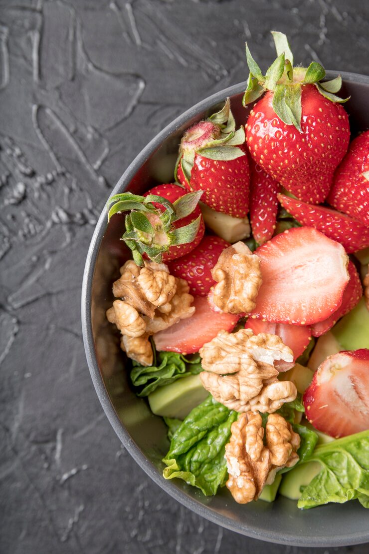 Вкусный и привлекательный салат из клубники со шпинатом станет еще интереснее, если добавить грецкие орехи и заправить его смесью соевого соуса, сахара и оливкового масла.