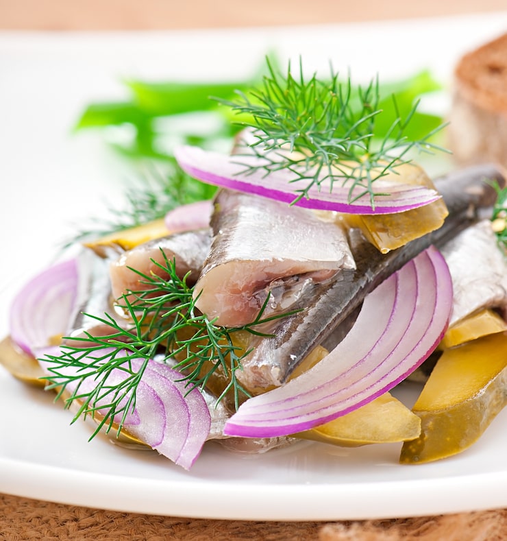 Затем выложите нарезанную скумбрию. Сверху распределите мелко нарезанный лук. Я предпочитаю использовать синий лук, так как он обладает более мягким и сладким вкусом, и его не требуется мариновать. Однако, если вы используете обычный репчатый лук, рекомендую замариновать его в смеси уксуса, воды и сахара на 15 минут.