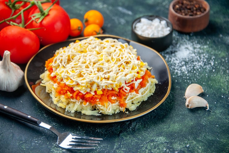 Добавьте в слоеный салат консервированную кукурузу. Теперь уберите его в холодильник на 15-20 минут, чтобы он настоялся.