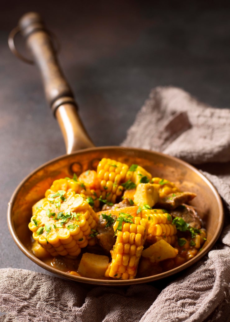 За обжаренными овощами, следующими в кастрюлю, идет кукуруза. После того, как содержимое закипит, следует добавить соль и перец.