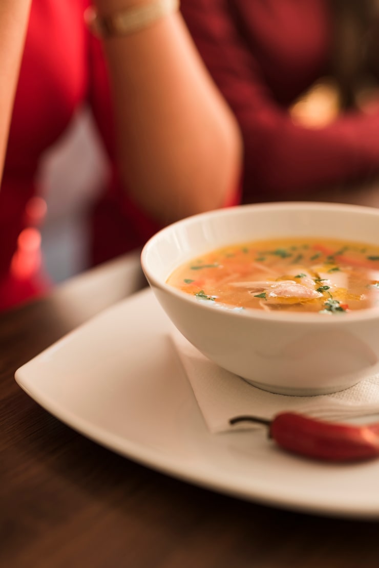 Этот суп обладает легкостью и одновременно насыщает организм. Он приготовлен в соответствии с отборными традициями азиатской кулинарии, с использованием кинзы, имбиря и соевого соуса. Семгу можно заменить лососем или другой разновидностью жирной красной рыбы. Картофель в этом блюде не используется, его функцию выполняет рис, который готовится отдельно.