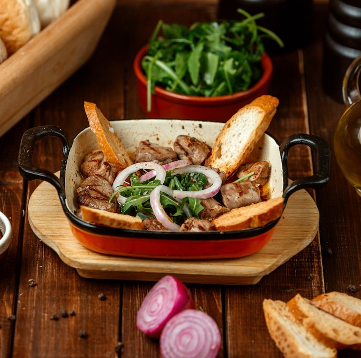 Суп обладает высокой питательностью и густую консистенцию благодаря овощному пюре, а также отличается восхитительным ароматом копчения. Паста из болгарского перца – это уваренное пюре, приготовленное из запеченного перца. Если у вас нет такой пасты, используйте запеченный или свежий перец. Для шашлыка можно использовать любое мясо, однако наиболее вкусным он получается из свиной шеи.