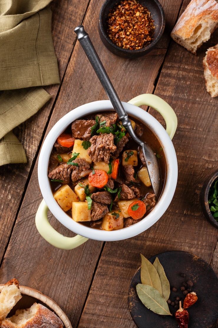 положите овощи в кастрюлю и готовьте на умеренном огне до тех пор, пока картофель не станет мягким, а мясо – полностью приготовится. Добавьте соль и специи по вкусу.
