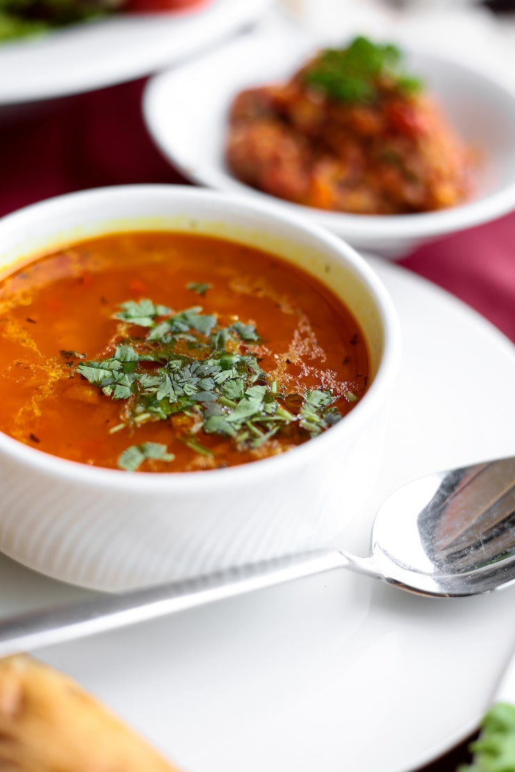 После закипания добавьте кориандр, немного свежего чили и лавровый лист. Приправьте суп солью по вкусу, еще раз доведите до кипения и выключите огонь. Дайте настояться под крышкой 10-15 минут.