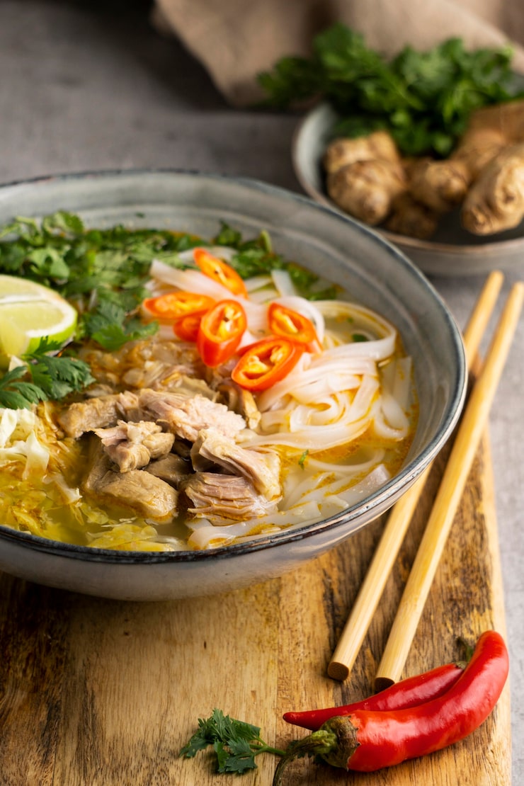 Всыпьте лапшу и добавьте зелень укропа или петрушки. Продолжайте варить суп еще пять минут.