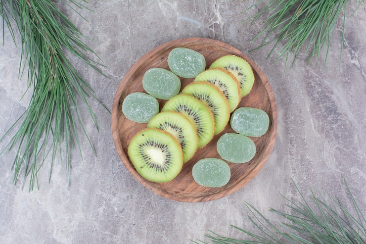 Снимите кожуру с киви, промойте его под водой, нарежьте на ломтики или кубики и выложите на крем. Подавайте десерт к столу.