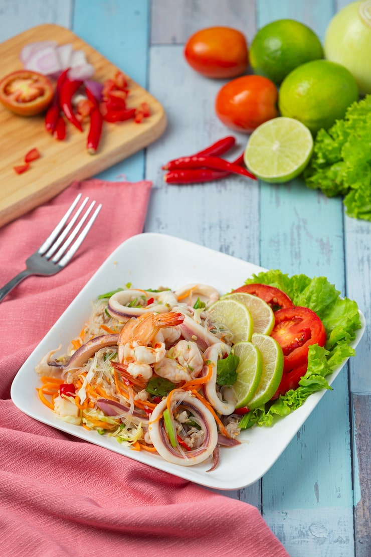 Этот восхитительный тайский салат с морепродуктами, обладающий легкой остротой и пикантным вкусом, обязательно придется вам по вкусу. Его можно подавать как на праздничный стол, так и на обычный обед или ужин.