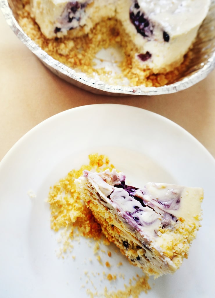 Аккуратно перенесите торт на блюдо для подачи, снимите защитную пленку и декорируйте его на свой вкус. Для украшения я использовала взбитые сливки, ягоды и листья мяты.