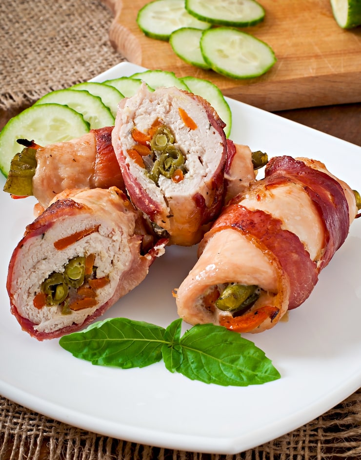 Выложите ровным слоем начинку, по краям оставьте свободными по 2 см. Аккуратно скатайте рулет и переложите его на противень. Смажьте маслом, выпекайте в заранее разогретой до 180 градусов духовке до золотистого цвета. Примерно 20-25 минут.