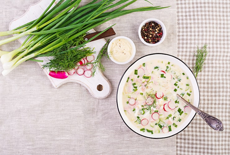 Истинный рецепт аппетитной окрошки на кефире не обязательно содержит редис (который я, признаться, не особенно люблю), лук и другие компоненты. В первоначальном варианте это представляет собой густую, почти пастообразную смесь из мацони и обилия зелени, приправленная огурцом. Получается освежающее и необычное блюдо. Попробуете?
