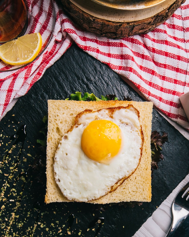 Яичница с гренками уже на столе. Белки прожарились, но желтки остались слегка недоготовленными.