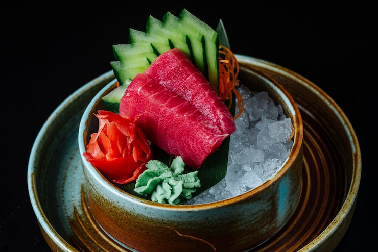 Переложите японский суп с лососем в тарелки и подавайте к столу в горячем виде.