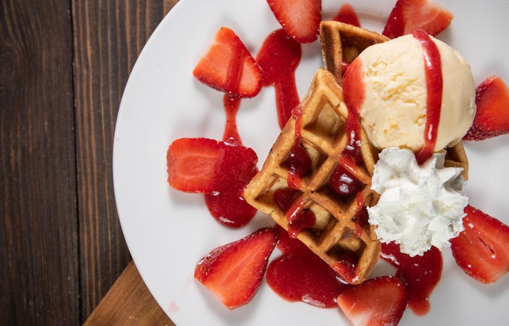 Насладитесь готовыми вафлями, полив их любимым сиропом, и подавайте на стол.