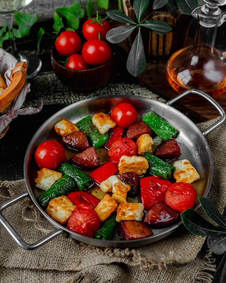 Вмешайте нарезанные кубиками или дольками помидоры. Продолжайте готовить все ингредиенты вместе еще несколько минут.