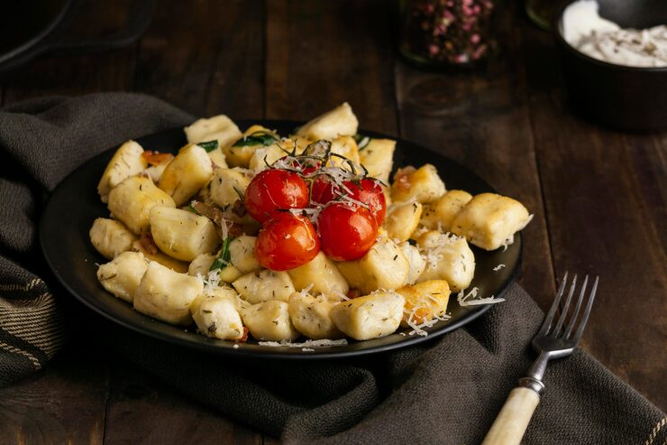 Картофель нарезается крупными дольками или кусочками, отваривается, затем обжаривается до золотистой корочки на сковороде и практически перед подачей посыпается обильно тёртым сыром. Сыр плавится и буквально обволакивает каждый клубень. Что может быть проще и вкуснее? Подавать такое блюдо можно самостоятельно или в качестве гарнира.